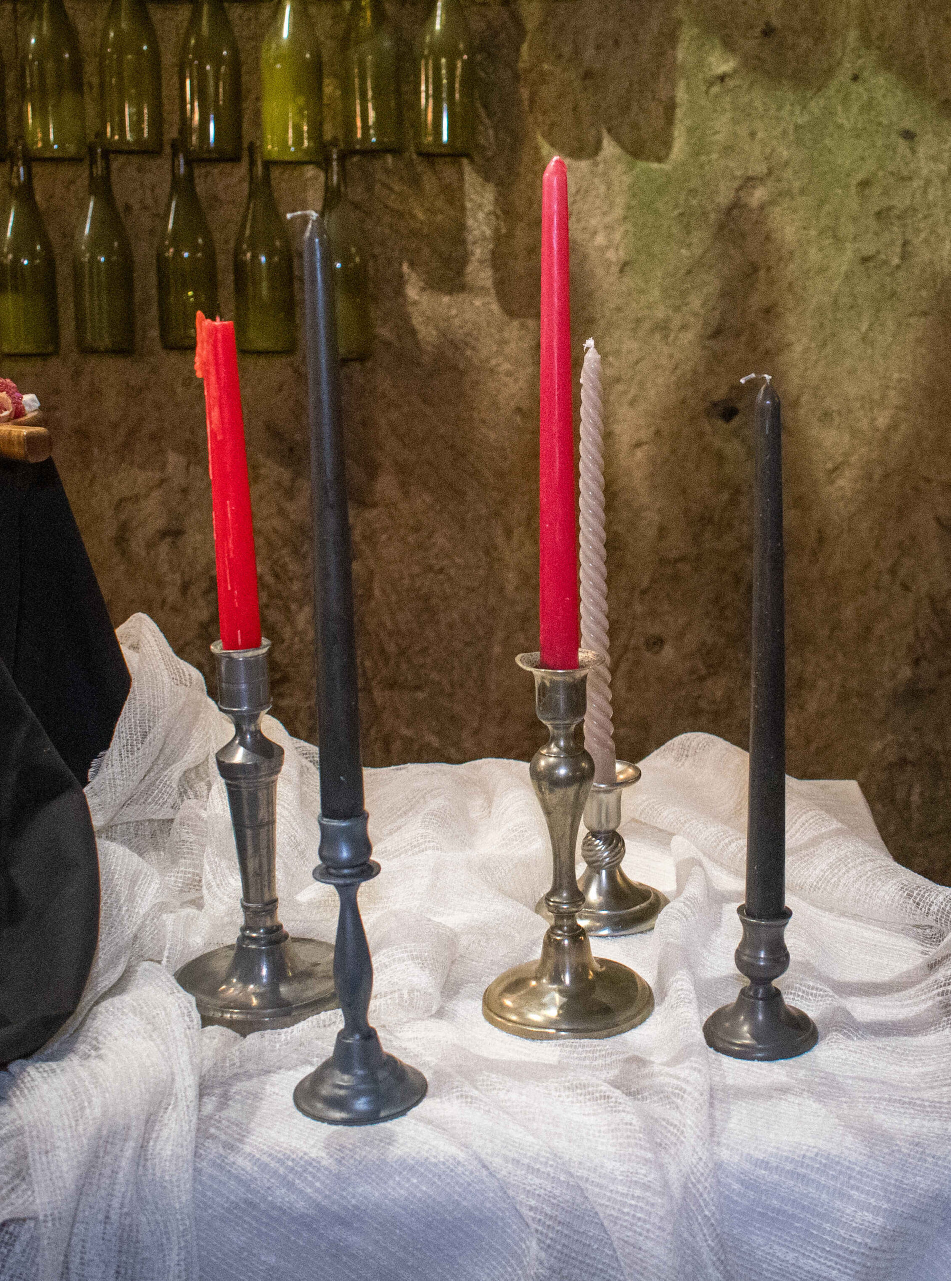 Les bougeoirs en étain sont dépareillés, ils sont de différents modèles du fait de leur caractère authentiquement ancien. Ils sont tous autour des mêmes hauteurs ou font l’objet d’un article à part.