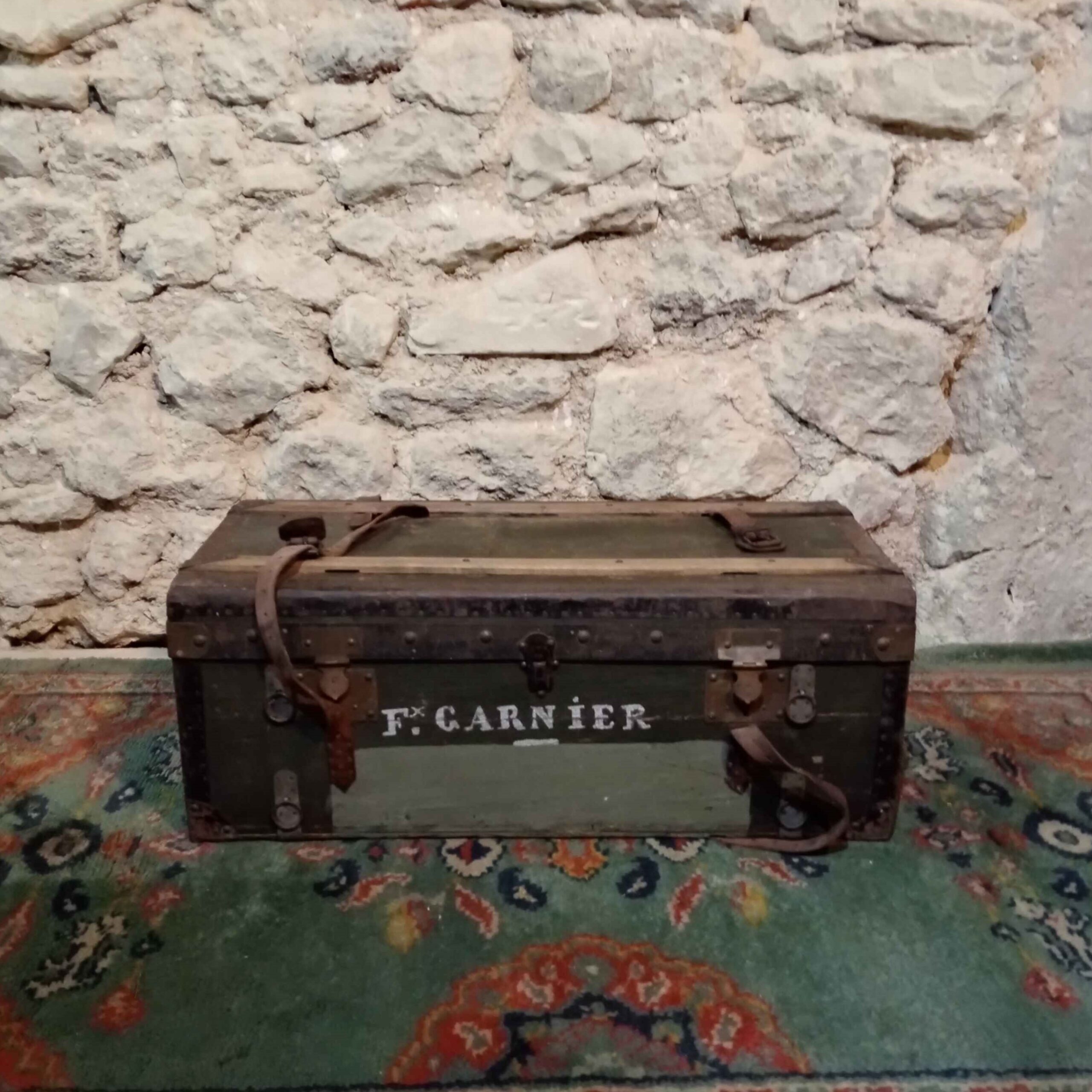 Malle en bois, mention “Garnier.” Cette jolie malle, abimée de part son usage peut servir dans toute vos décoration champêtre et habiller votre évènement.