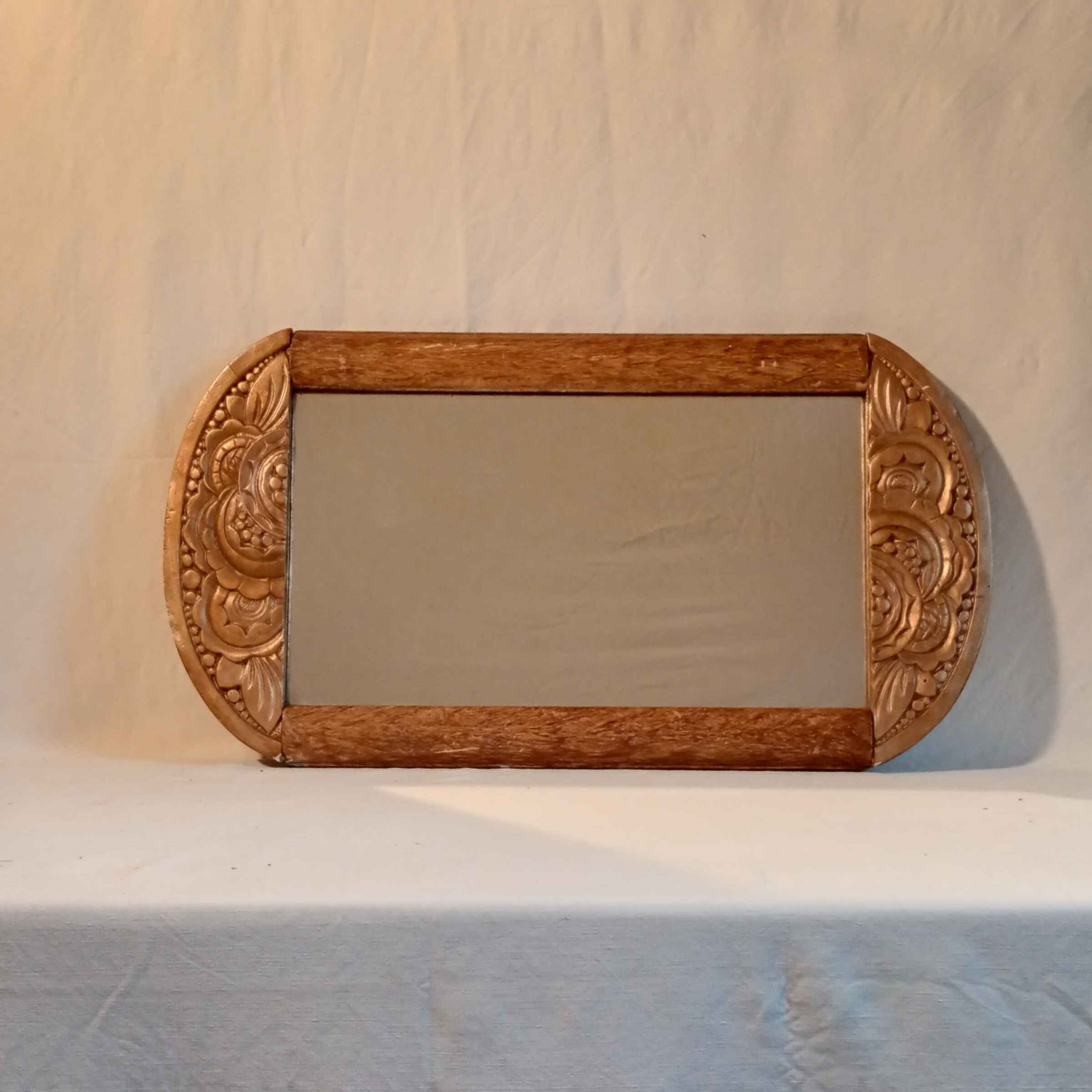 Miroir type art nouveau doré. Ce superbe miroir sculpté à motif de fleur, sera magnifique dans votre pièce ou dans votre décoration pour tout usage. Il est à adosser à un support.