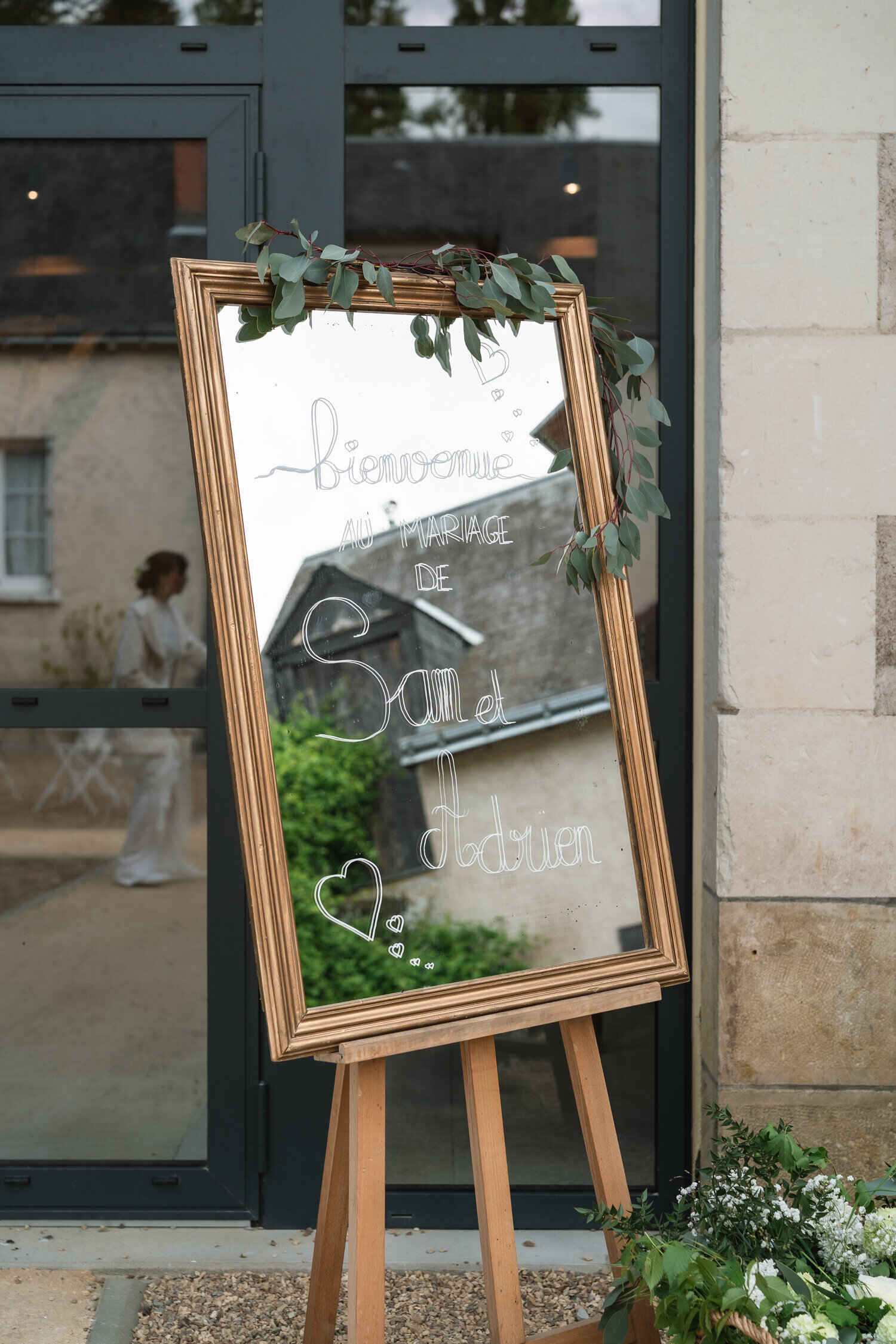 Grand miroir en bois doré. Ce magnifique miroir en bois doré pourra vous permettre de faire un panneau d’accueil, un plan de table, un menu ou simplement habiller votre décoration. Il est à adosser à un support.