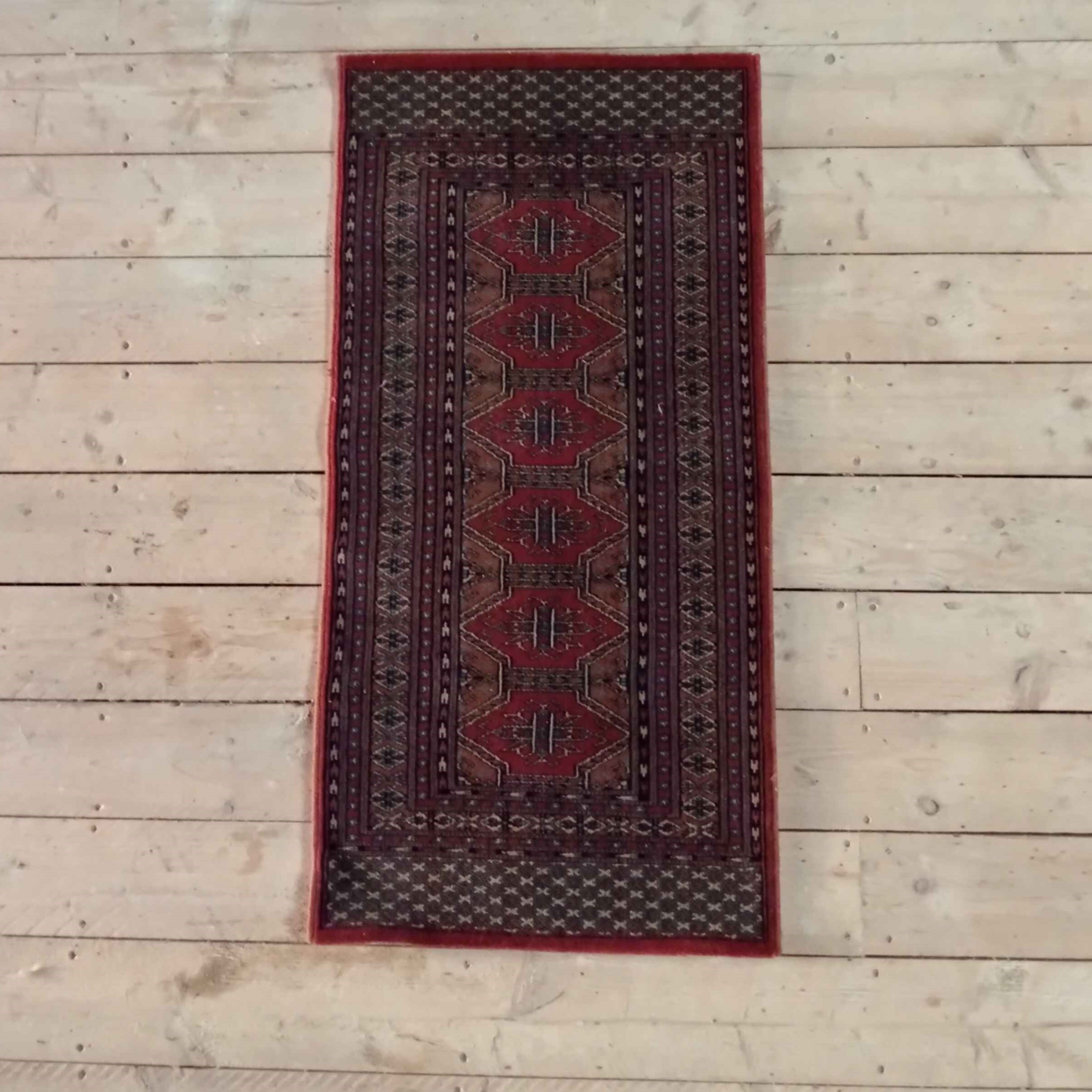 Tapis allongé au décor rouge, très élégant pour habiller un coin cozy de décoration. Dimensions: 119cm par 60cm.