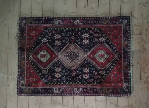 Tapis de couleurs rouge et bleu, classique avec ses motifs géométriques et intemporel, il ajoutera une touche chaleureuse à vos décorations. Dimensions: 153 cm par 108 cm.
