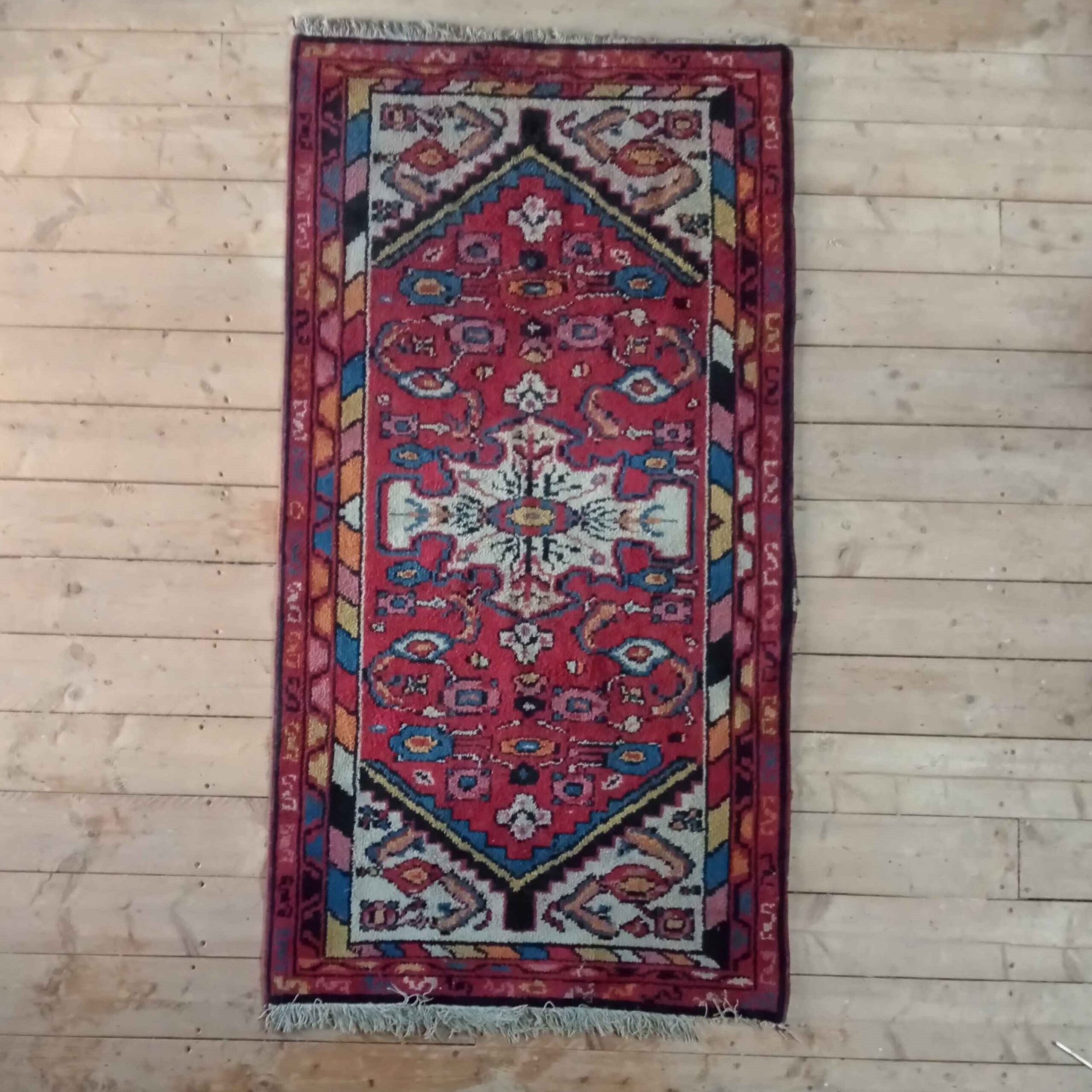 Tapis allongé décoré de motifs rouge ou bleu, aux couleurs chaleureuses pour vos cérémonies, décorations ou tablées. Dimensions: 197 cm par 100 cm.