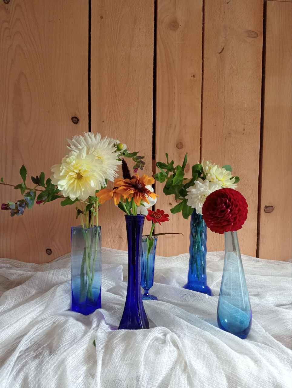 Vases en verre bleus dépareillés ou non, en fonction du nombre et du style demandé. Contactez-nous pour échanger sur votre besoin.