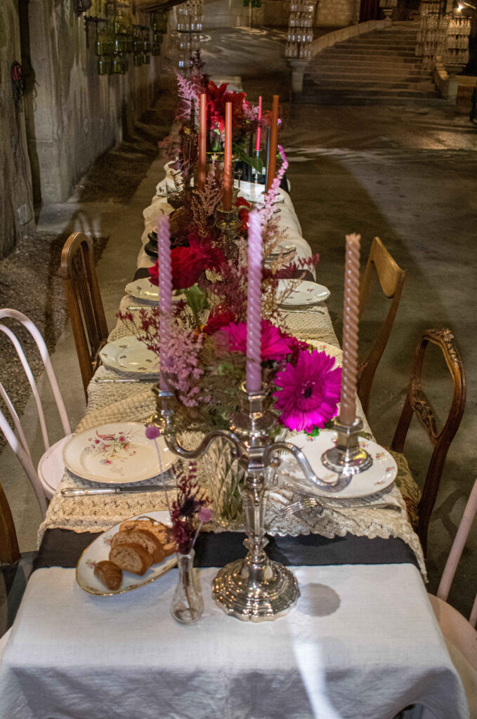 La table est l’élément dont nous sommes les plus fières sur ce shooting, elle a été travaillée dans ses moindres détails. A commencer par le tissu de table avec des nappes de base réhaussées de dentelle travaillée et de nappes noires pour casser le côté traditionnel et lisse du mariage en blanc. Des supports en bois noirci permettaient de donner de la hauteur aux éléments en toute élégance, une pièce maitresse en centre de table attirait le regard sans casser le visuel entre invités. Les chandeliers ont été choisi en métal argenté de même que les seaux à champagne et la vaisselle en porcelaine à fleur. Pour les fleurs justement, un mix entre soliflore en étain grisé et vase en verre et cristal taillé permettaient de laisser une large place aux compositions florales.